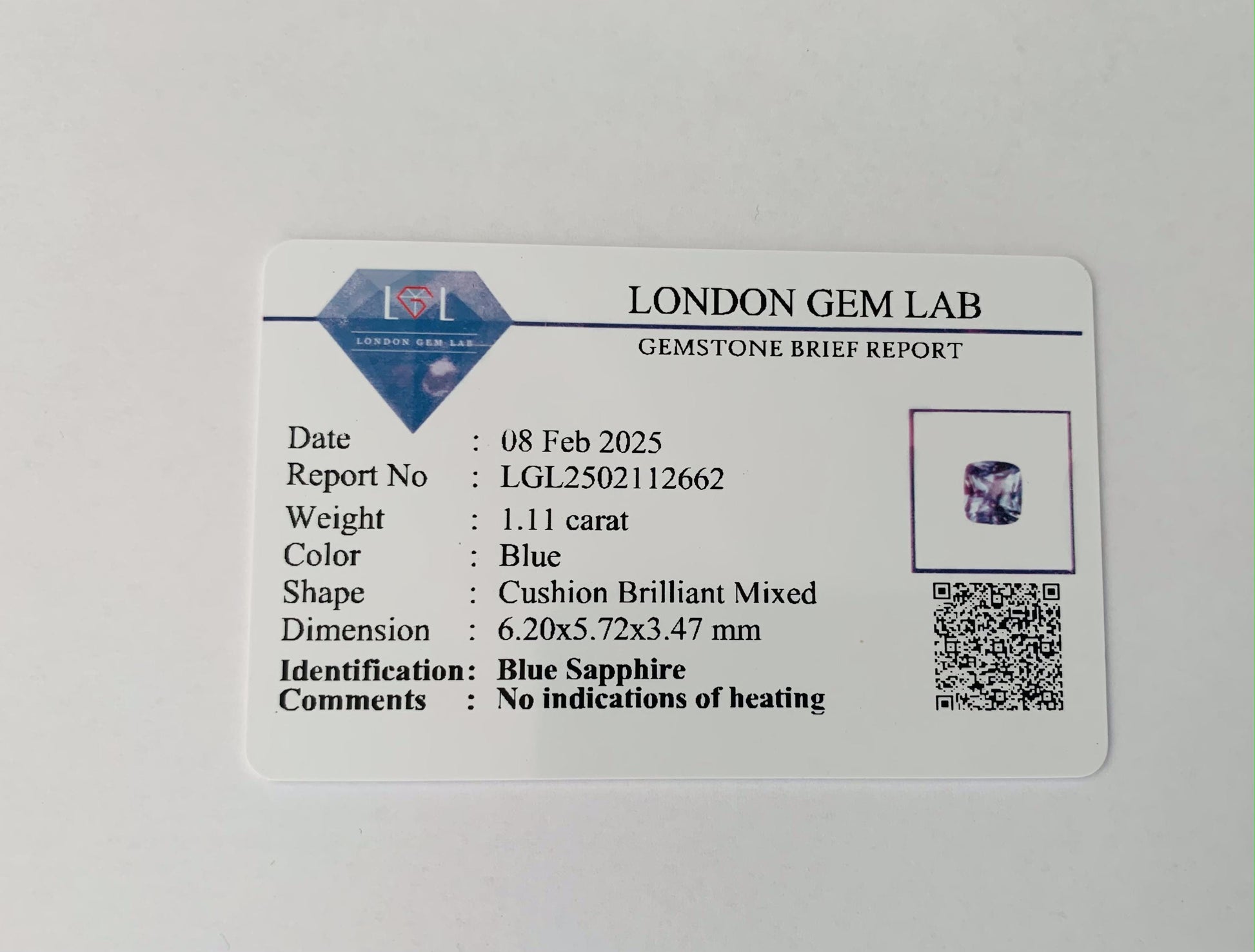 This 1.12-carat natural Blue Sapphire features a gentle, refined blue hue with excellent brilliance. Expertly cushion-cut to enhance its light reflection and clarity, this unheated gemstone retains its natural charm and authenticity.