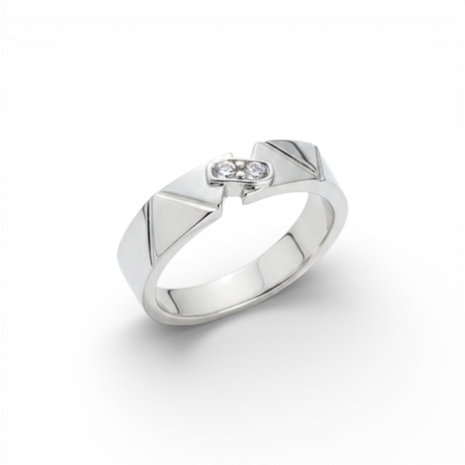 Strength meets sophistication. This ring features bold, recessed geometric facets and a smooth, high-shine finish. Two brilliant stones are inset at the signature interlocking point, providing a subtle, luxurious detail to a strong architectural design.