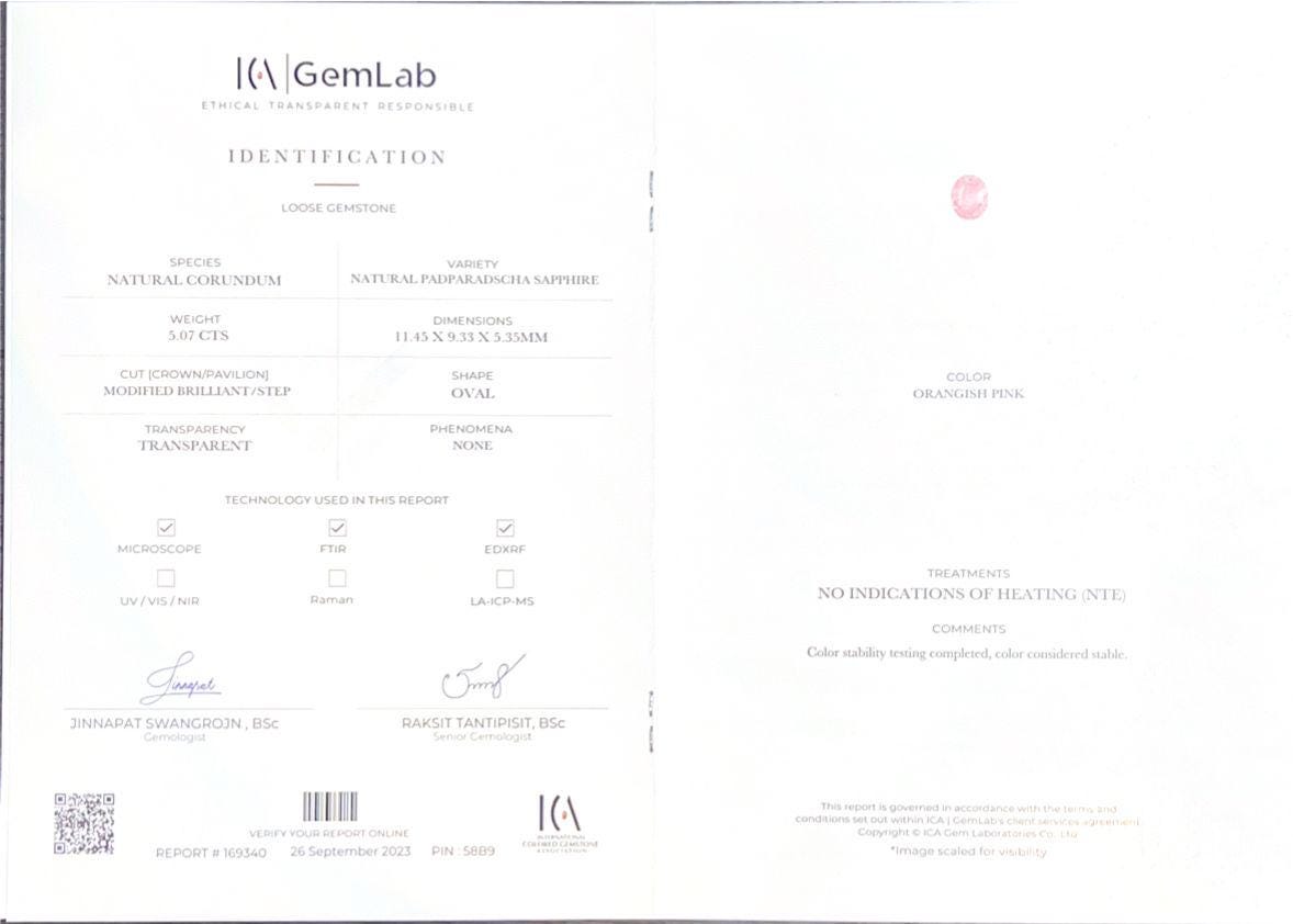 Discover the rare beauty of this 5.07-carat Padparadscha Sapphire, an unheated, ethically sourced gemstone from Ceylon, renowned for its exquisite orangish pink hue. Expertly crafted with an oval cut and VS clarity, this sapphire measures 11.41x9.36x5.34 mm, showcasing vibrant brilliance and natural elegance. Ideal for custom jewelry designs, such as unique engagement rings or investment-grade pieces paired with white or rose gold, this untreated gem radiates timeless sophistication. A perfect addition for jewelry lovers and collectors seeking high-quality, rare Padparadscha sapphires from Ceylon’s prestigious mines.