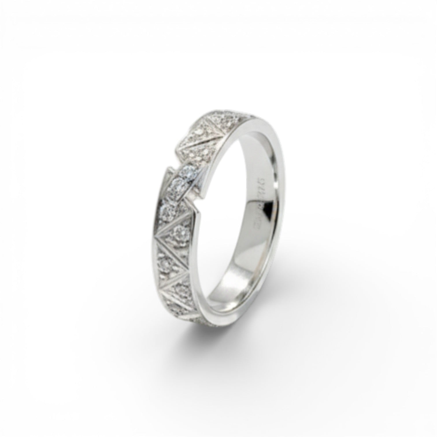 Every angle of this ring tells a story. It features a continuous band of triangular engravings and textured detailing, accented by a row of brilliant-cut stones at the center notch. Designed to be worn alone as a statement piece or paired with its geometric counterpart.