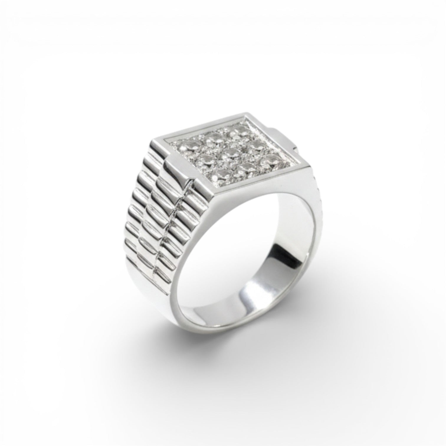 Make a definitive statement with The Vanguard. Crafted from high-polished sterling silver, this ring features a commanding square face densely set with sparkling stones for an icy, luxurious finish. The band is detailed with deep, ribbed grooves reminiscent of classic watch links, adding an industrial edge to a sophisticated design. Perfect for the modern man who appreciates bold geometry and undeniable shine.